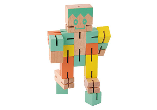 Drvena slagalica u obliku kocke zelene, narančaste i žute boje.